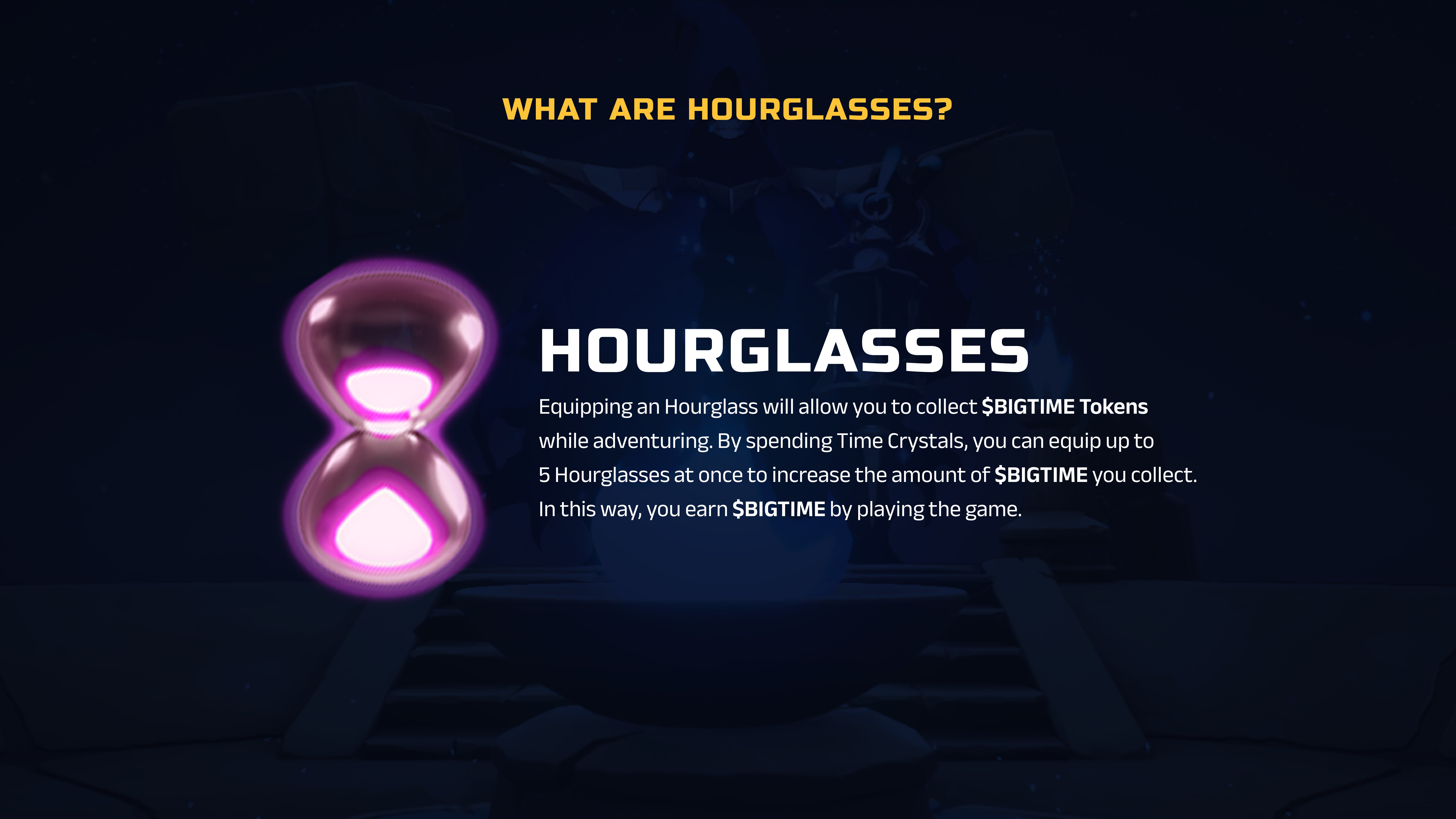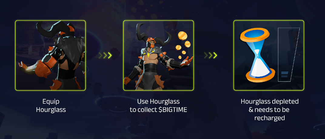 When equipped, **Hourglasses** allow players to acquire [**$BIGTIME Tokens**](https://wiki.bigtime.gg/big-time-economy/economy-components/resources/usdbigtime-tokens) while adventuring. The amount of [**$BIGTIME Tokens**](https://wiki.bigtime.gg/big-time-economy/economy-components/resources/usdbigtime-tokens) acquired increases depending on the number of equipped **Hourglasses** and their rarity.