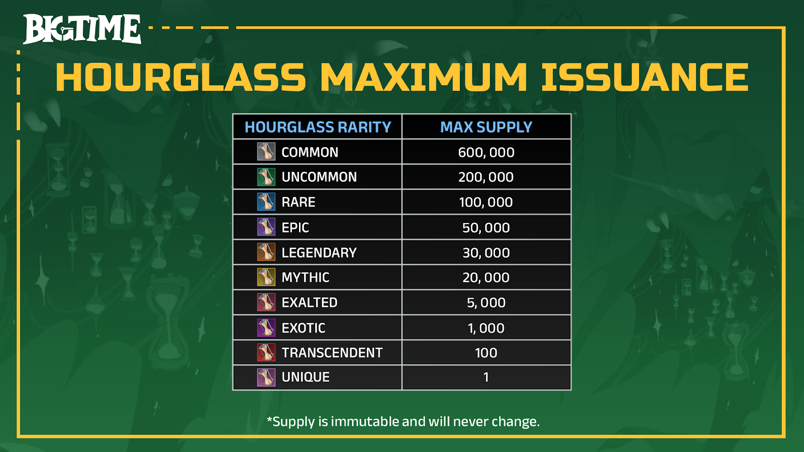 **Hourglasses** have ten rarity tiers: **Common** through **Unique**. The higher the rarity tier, the more [**$BIGTIME Tokens**](https://wiki.bigtime.gg/big-time-economy/economy-components/resources/usdbigtime-tokens) they can generate.