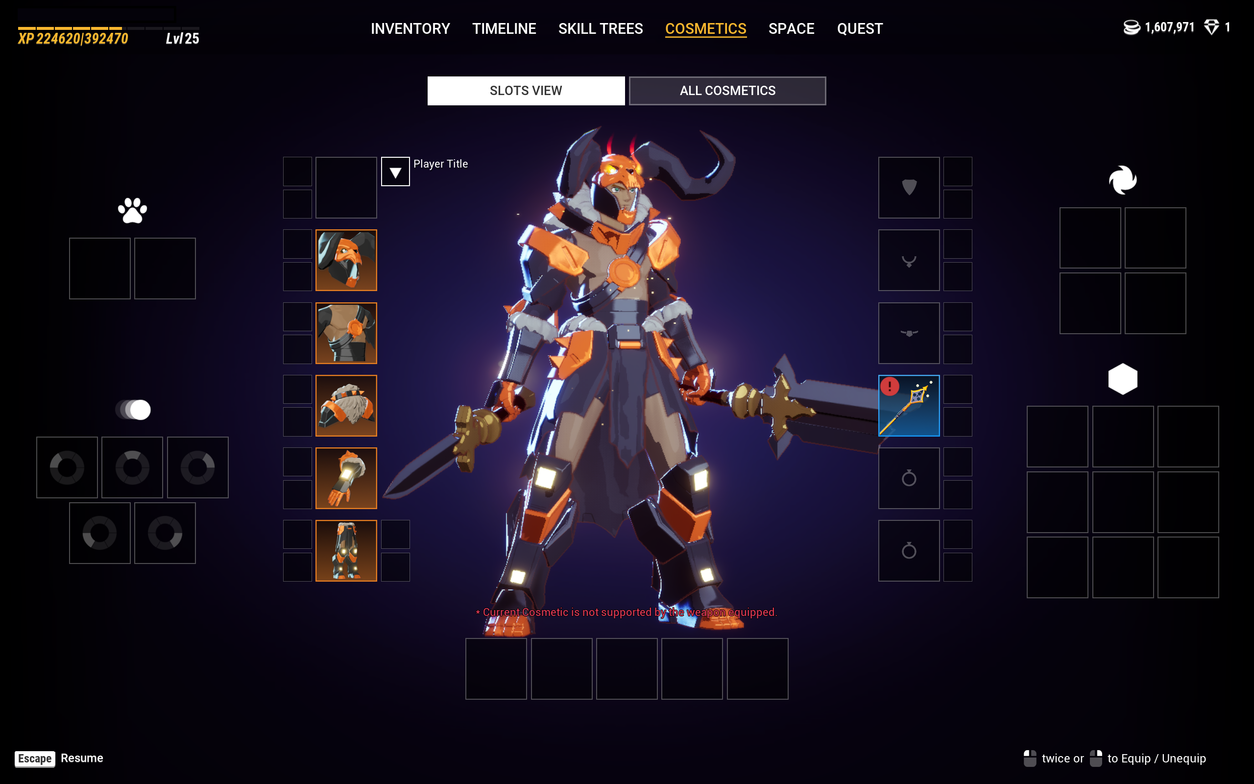 <figure><img src="https://3228690745-files.gitbook.io/~/files/v0/b/gitbook-x-prod.appspot.com/o/spaces%2FmbENrMdsRg8sJLWPWxS9%2Fuploads%2Fu3a4MJjqrTeFikiZAVrd%2Fimage.png?alt=media&#x26;token=a4e43ba9-b4e3-41b5-a18f-8f26b49e6c8a" alt=""><figcaption><p>Cosmetics view; you can look at your character with all the slots view; or all the cosmetics you have in game by clicking "All Cosmetics". To equip them just drag them to the proper slot or double click on them</p></figcaption></figure>